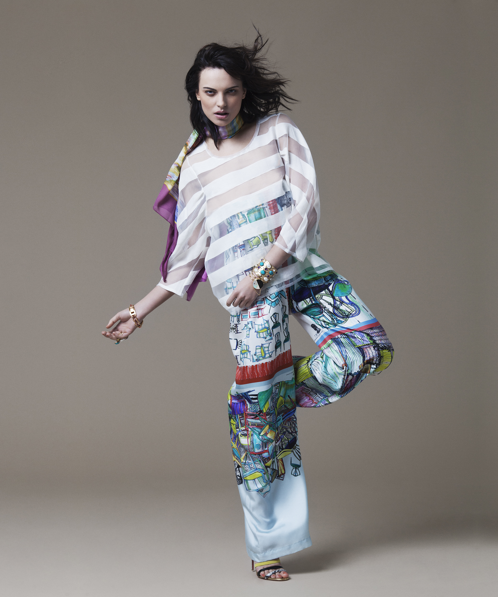 Woman with dark hair wearing sheer black top and patterned scarf.