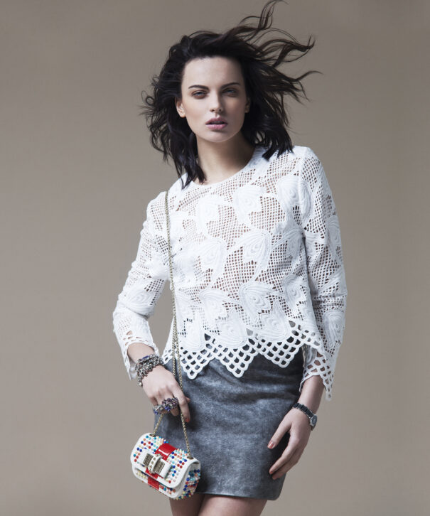 Woman with dark hair wearing a maroon cutout top and colorful pants, accessorized with a watch.